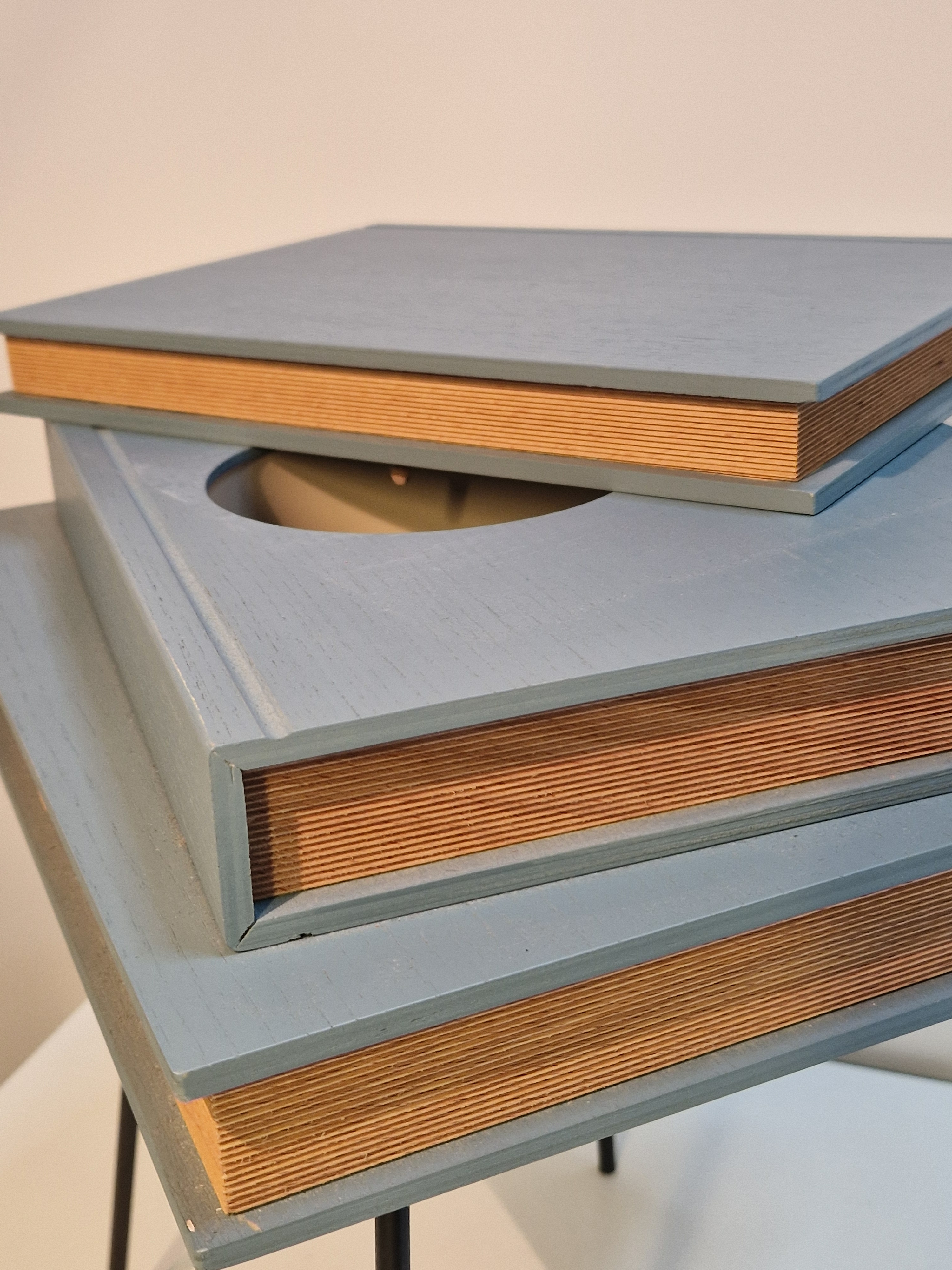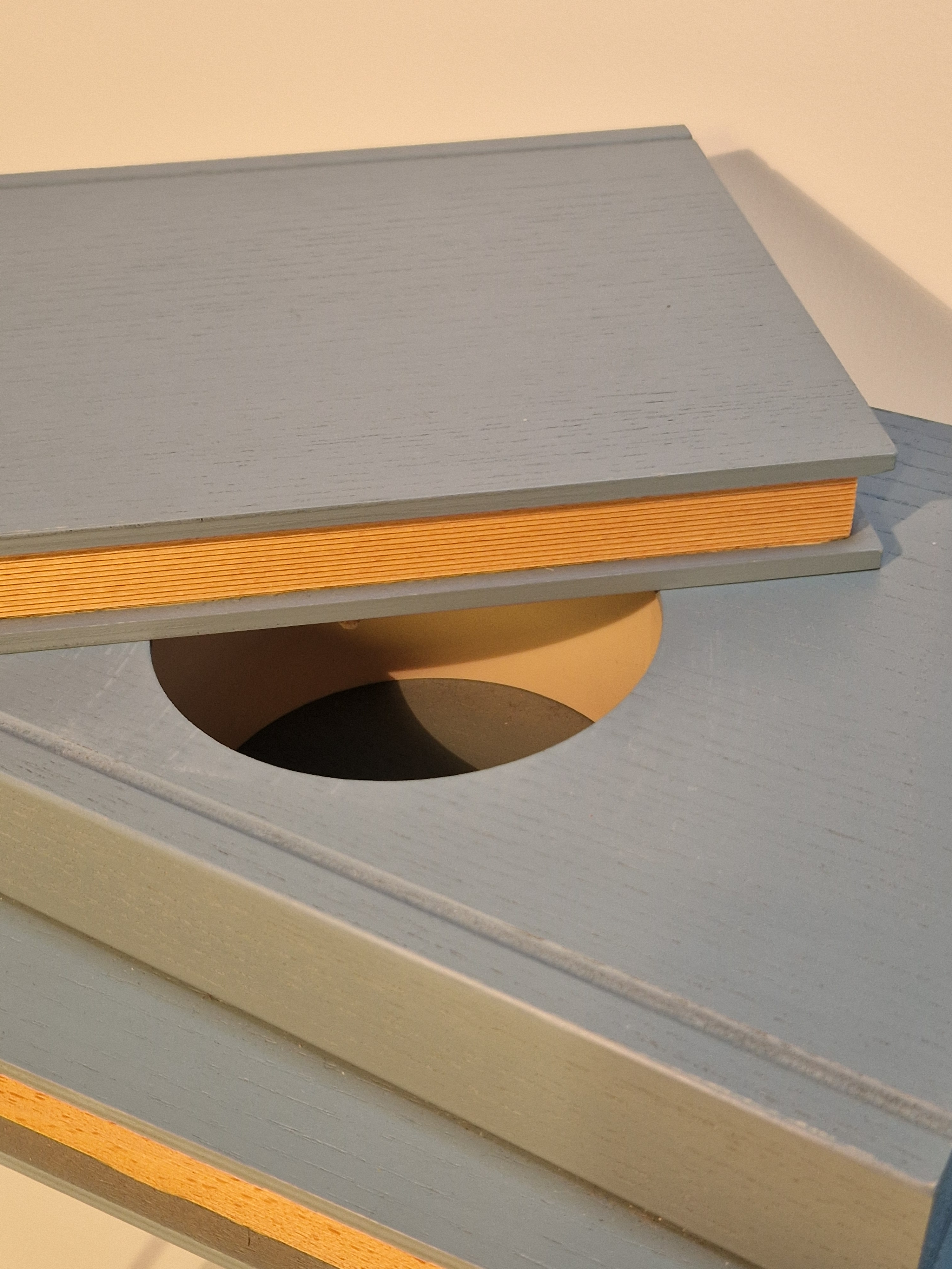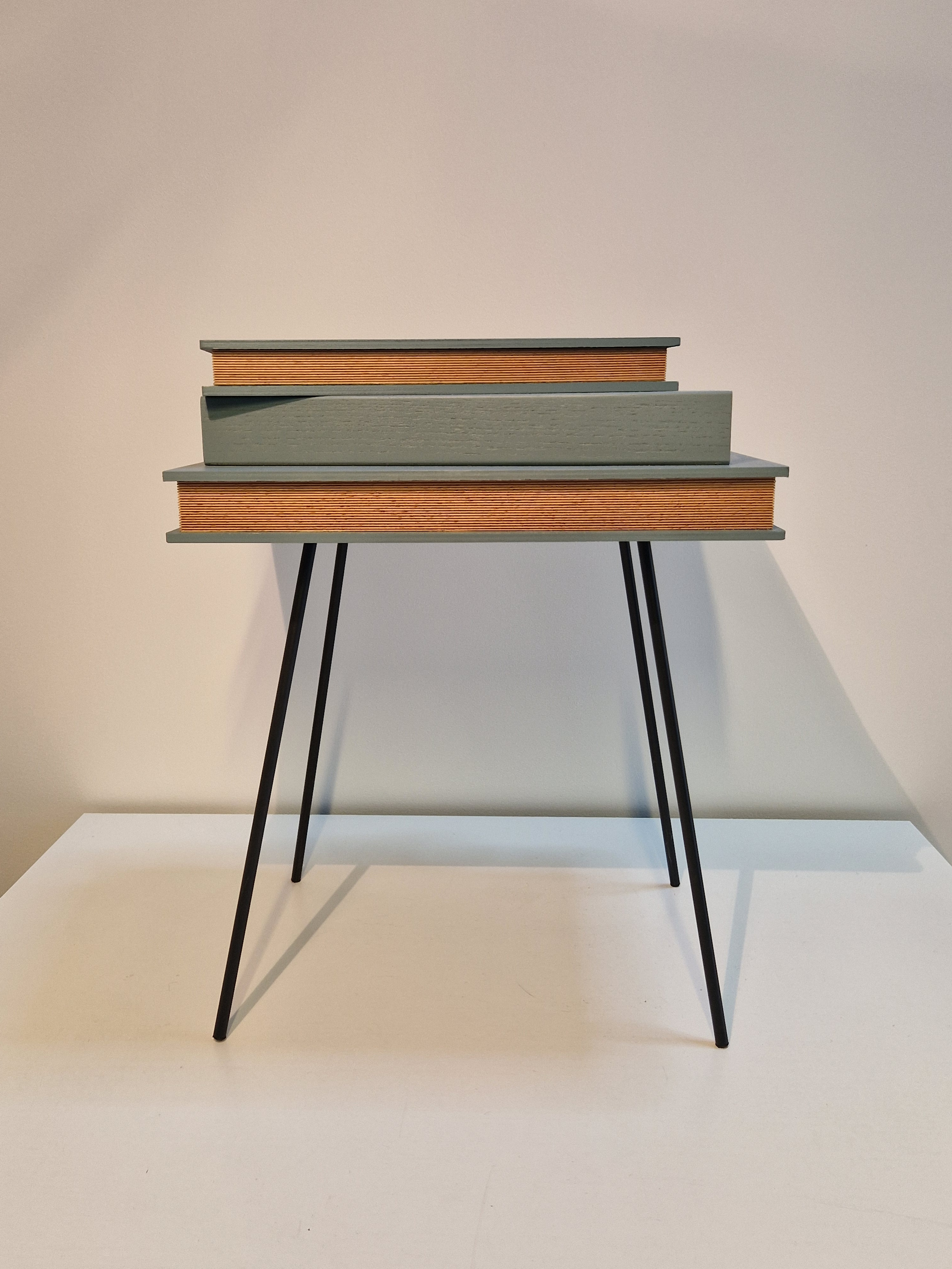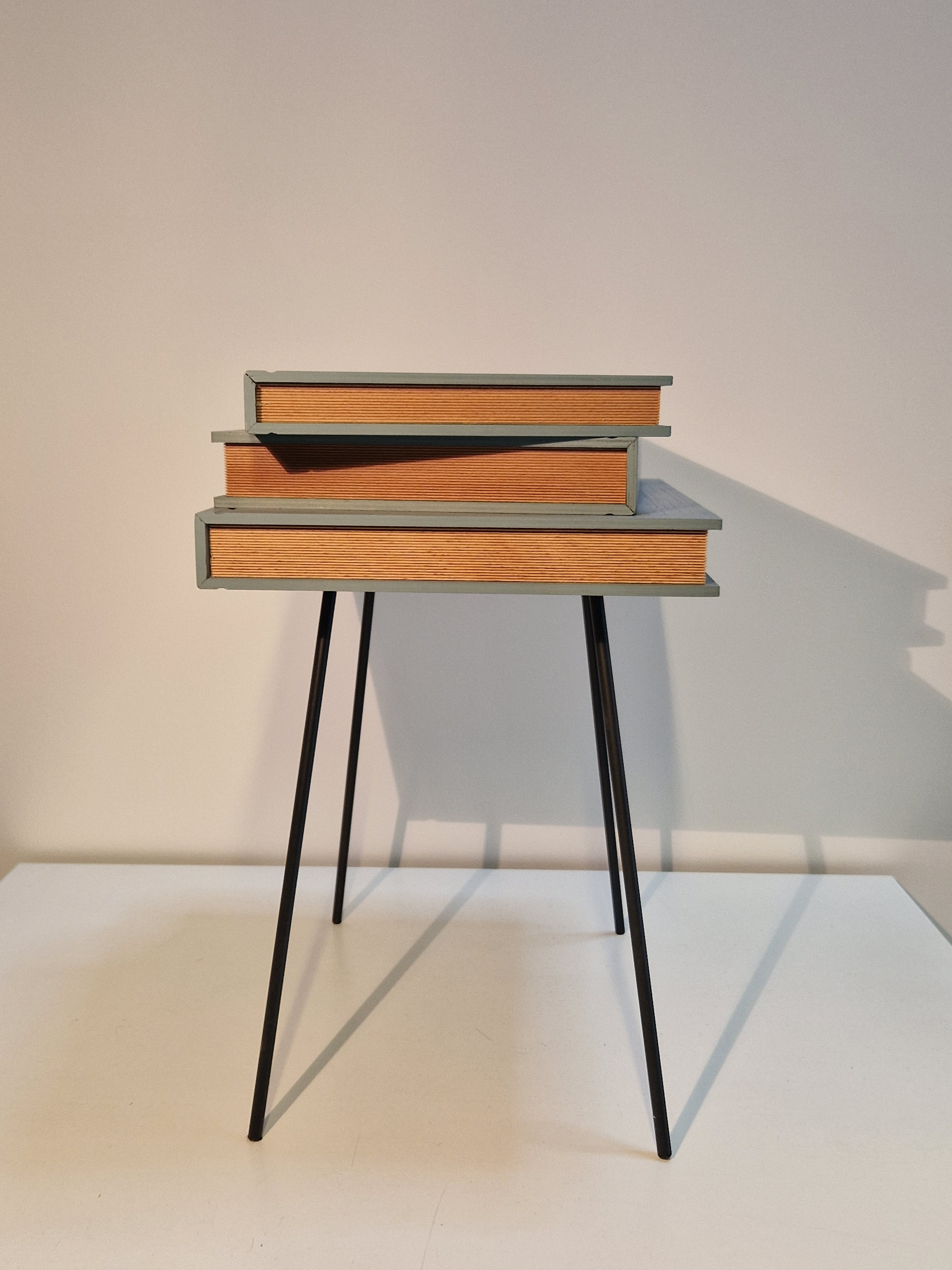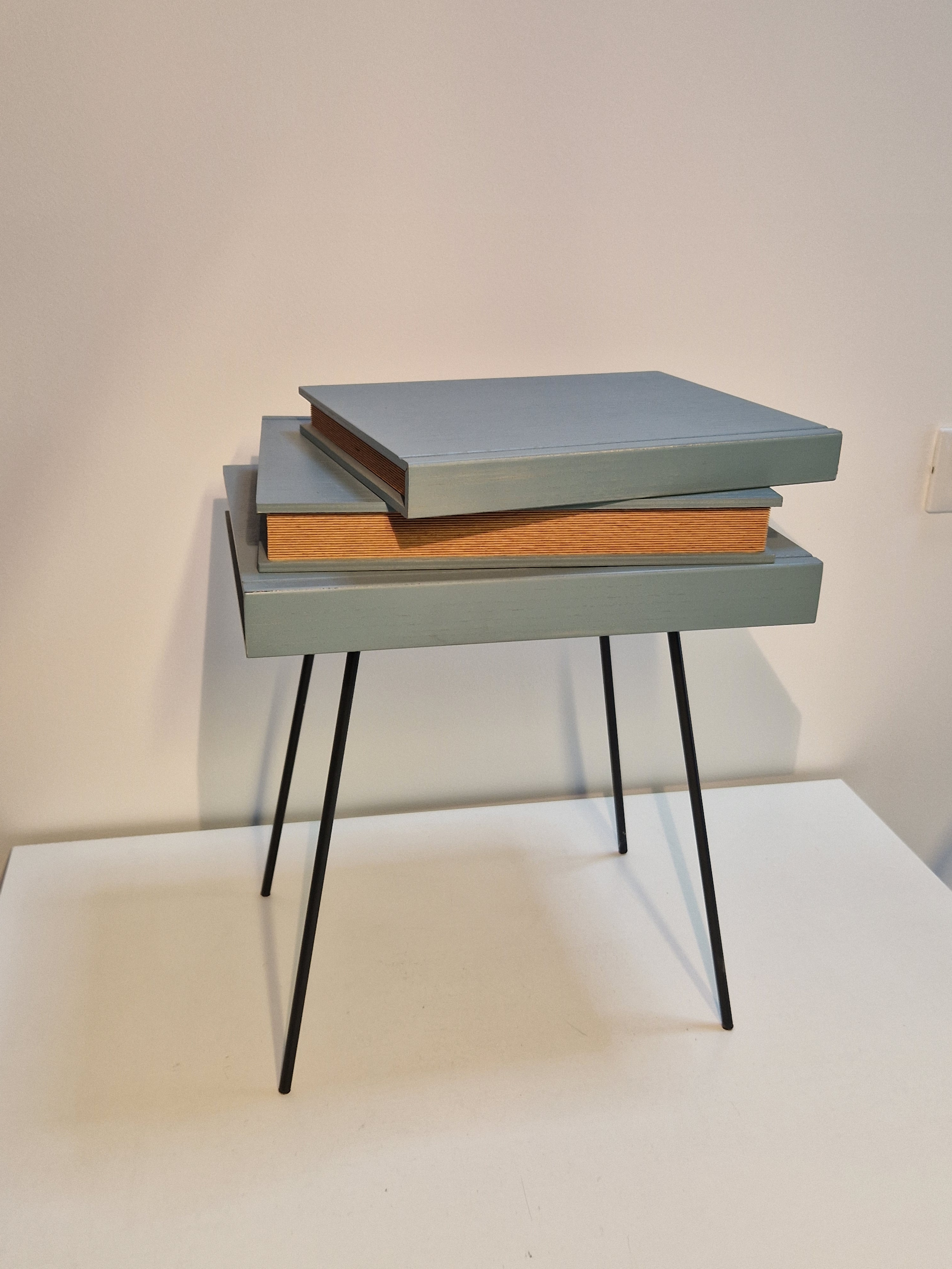 La finitura in legno laccato conferisce al tavolino un aspetto elegante e raffinato. Il top è impiallacciato con una combinazione di azzurro per le copertine e naturale sulle pagine dei libri, creando un contrasto visivo che cattura l'attenzione. Le gambe in metallo aggiungono stabilità e modernità al design complessivo.