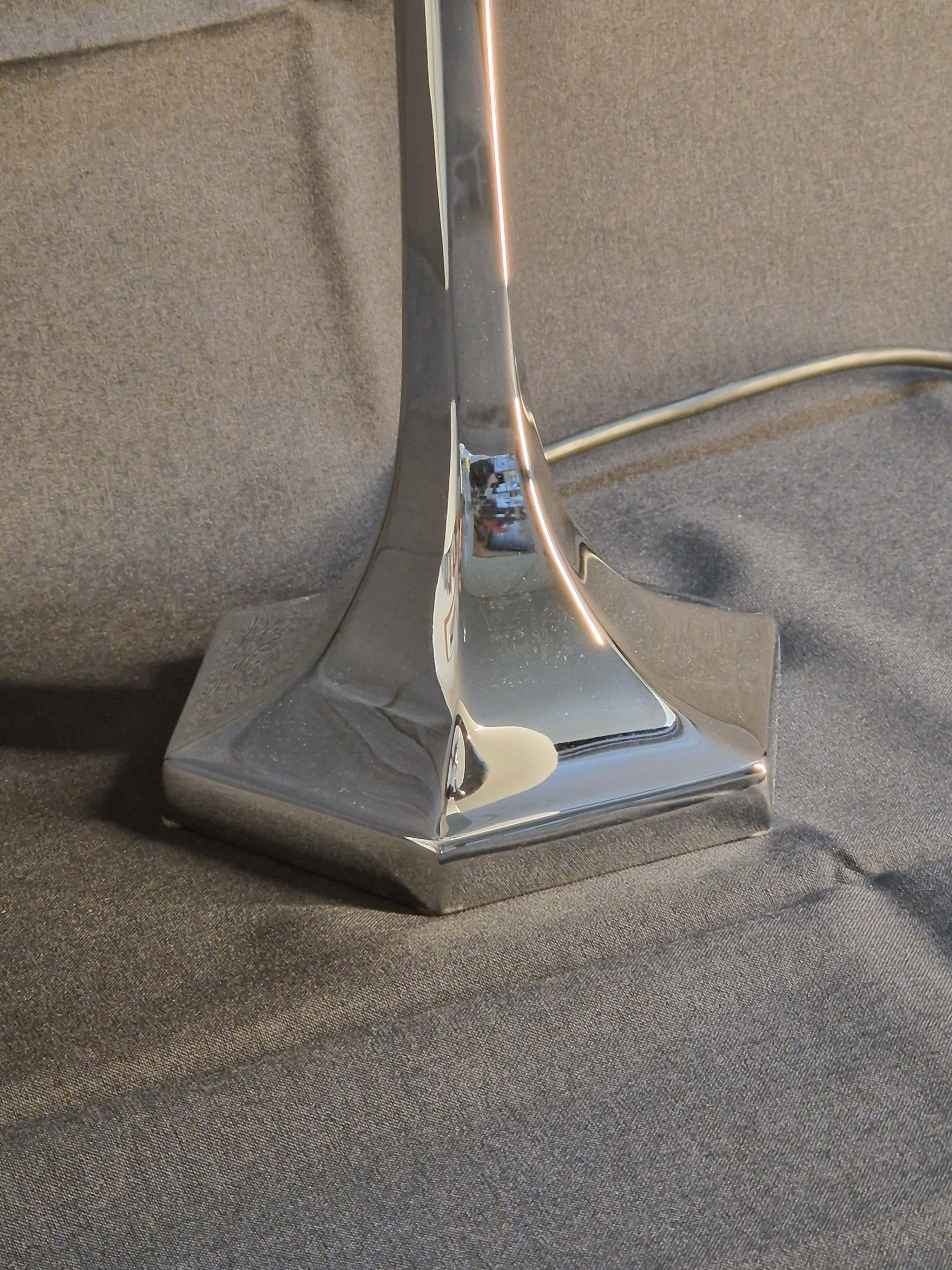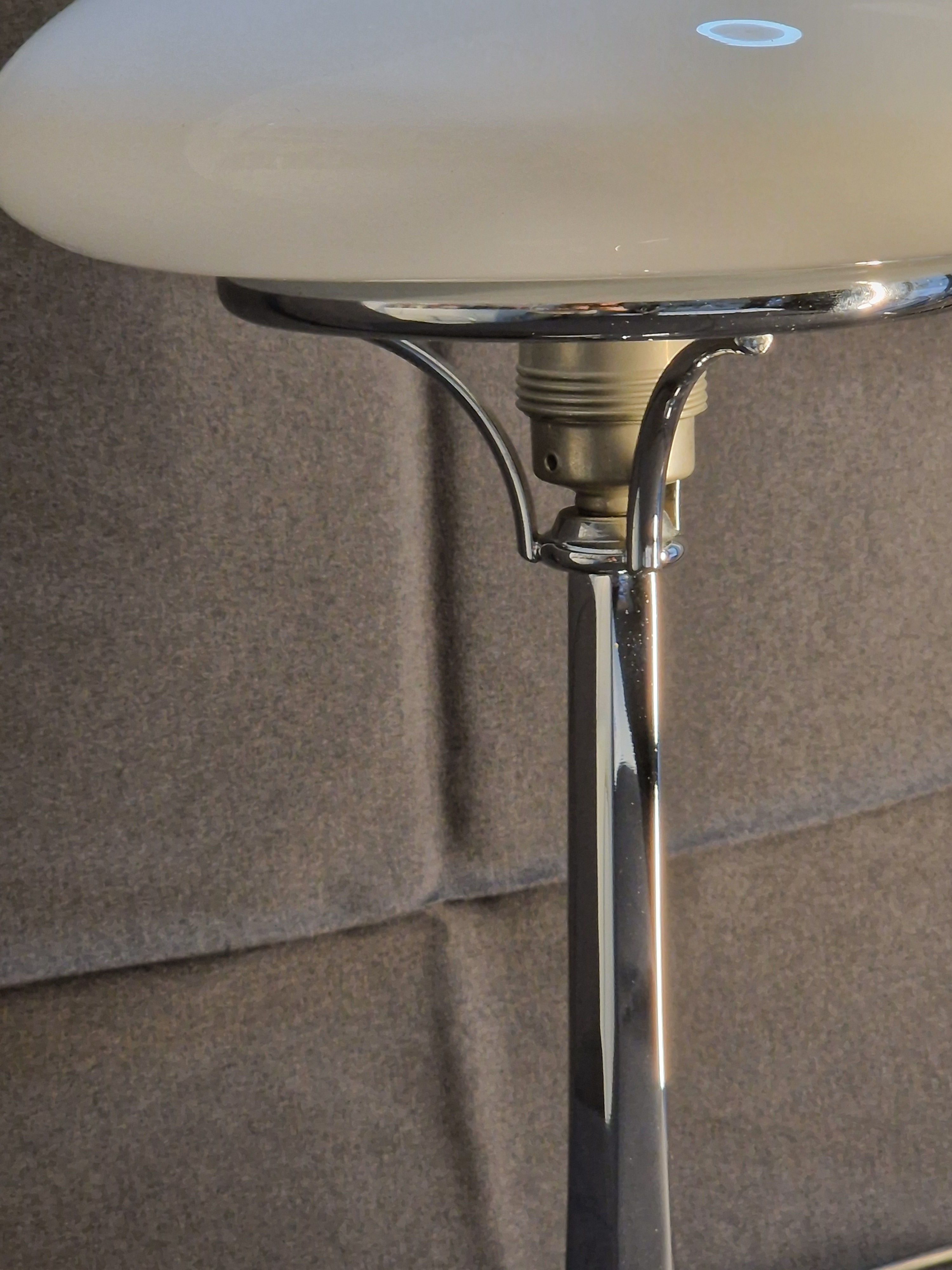 Realizzata con una base in fusione di ottone, la lampada offre una stabilità e una resistenza eccezionali. Il diffusore in pregiato vetro di Murano, noto per la sua qualità artigianale, diffonde una luce morbida e avvolgente, creando un'atmosfera calda e accogliente. La finitura in argento aggiunge un ulteriore elemento di lusso, rendendo questo pezzo non solo un oggetto funzionale ma anche un vero e proprio elemento d'arredo.